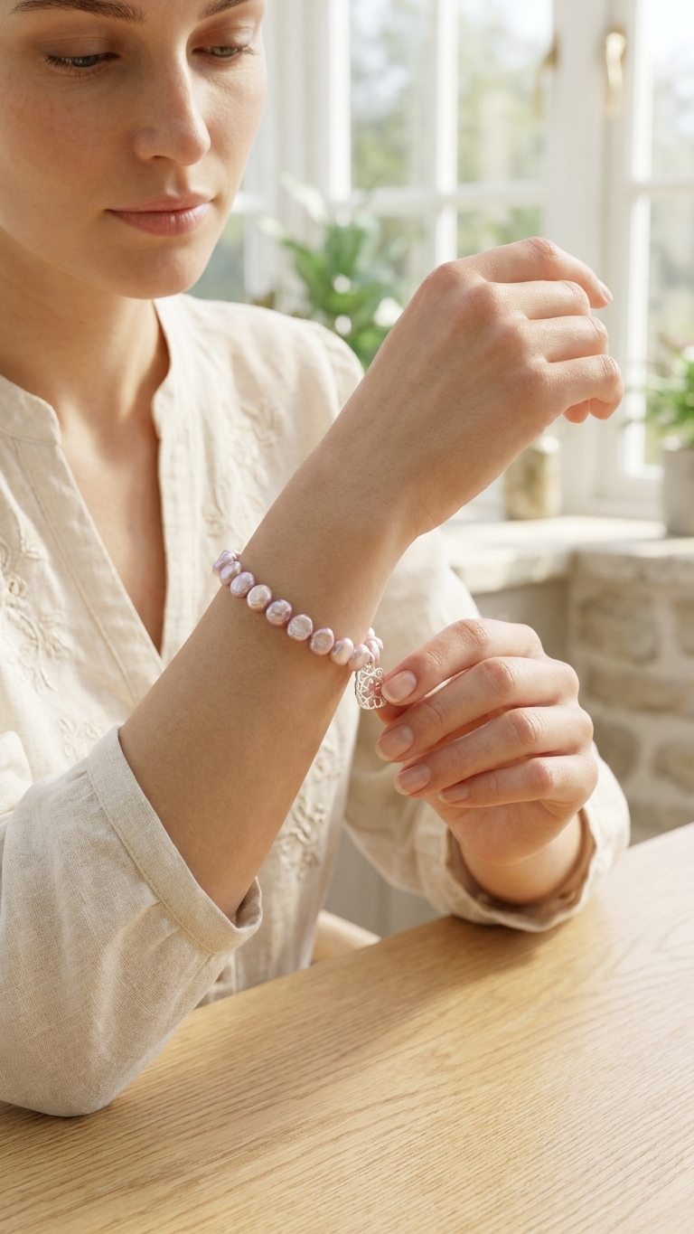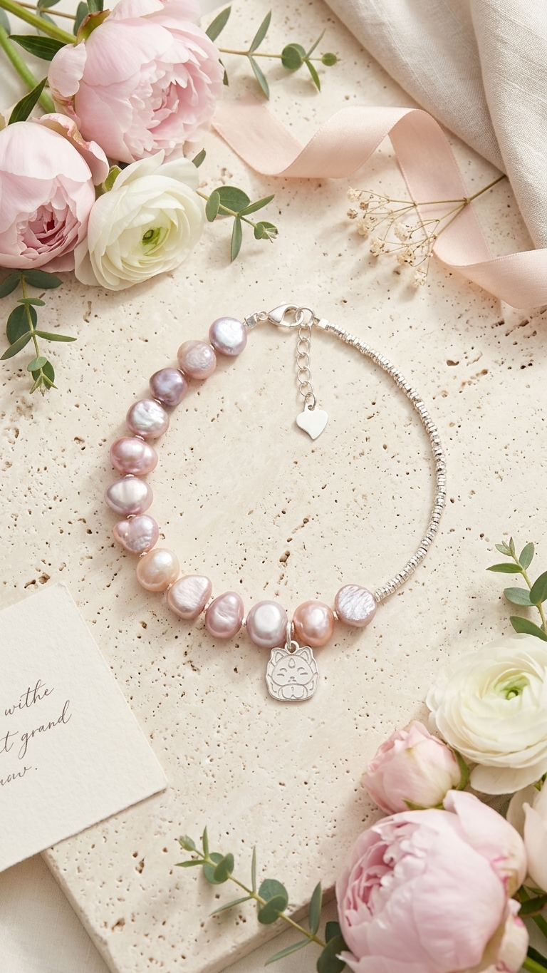✦ Piedras: Perlas de río naturales — tonos rosa, melocotón y malva