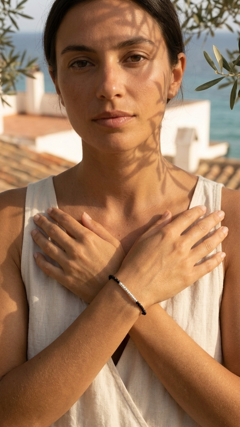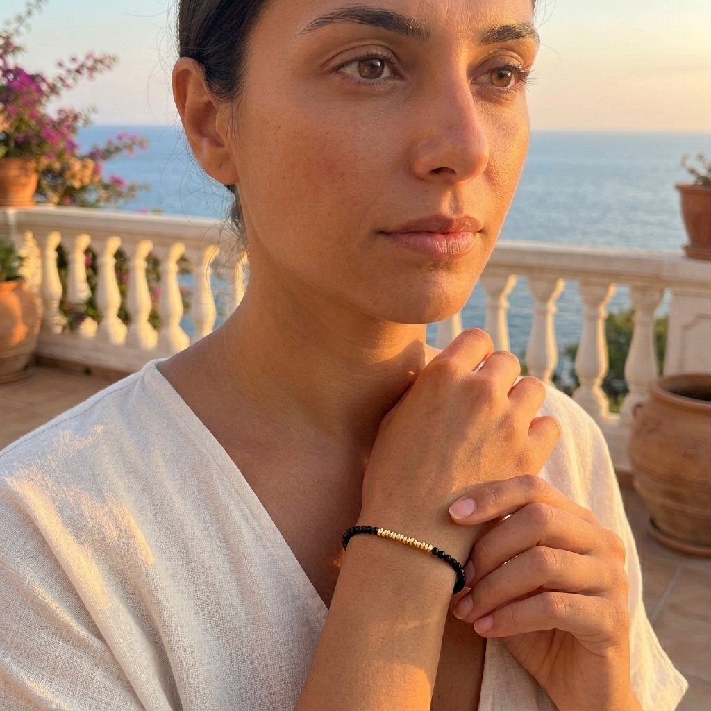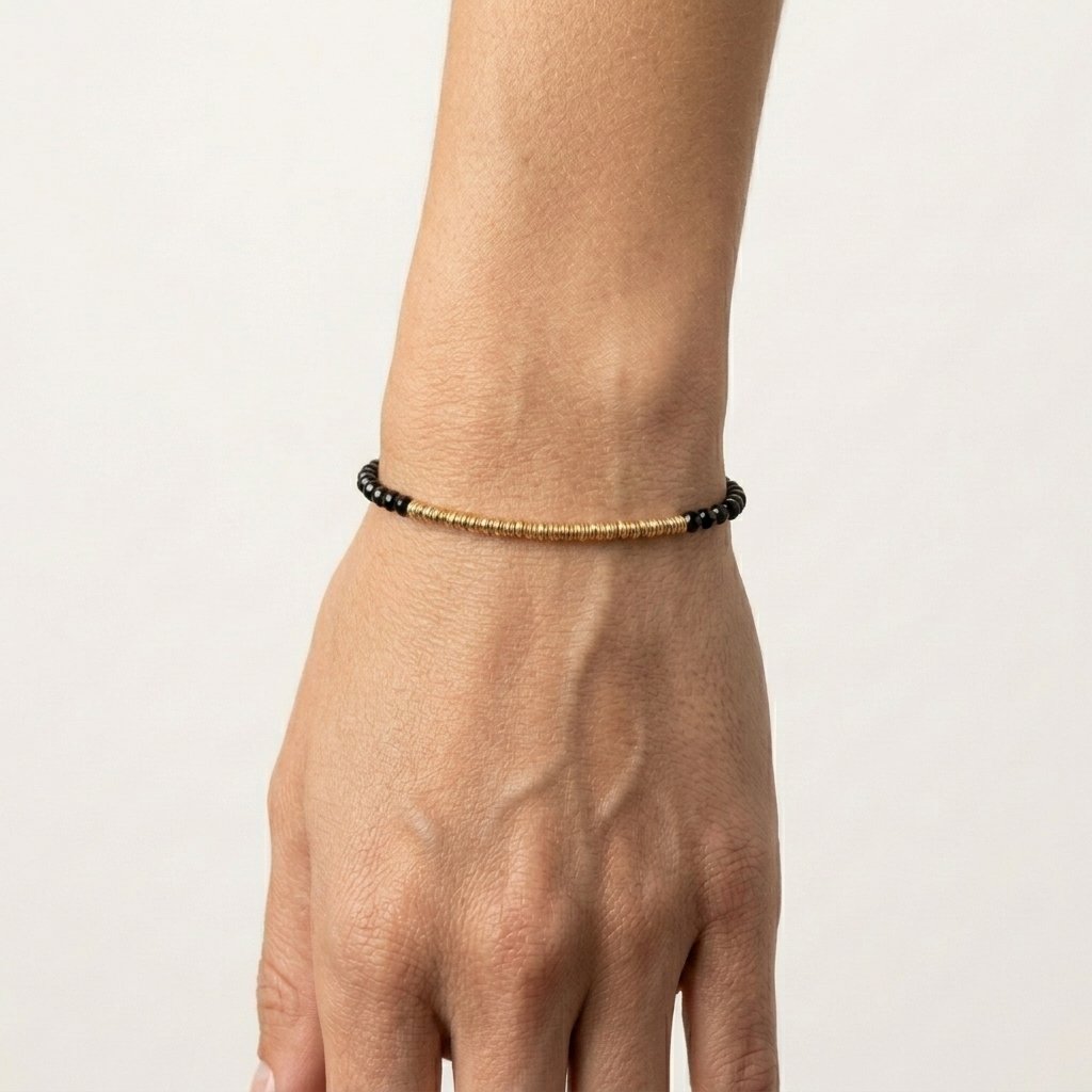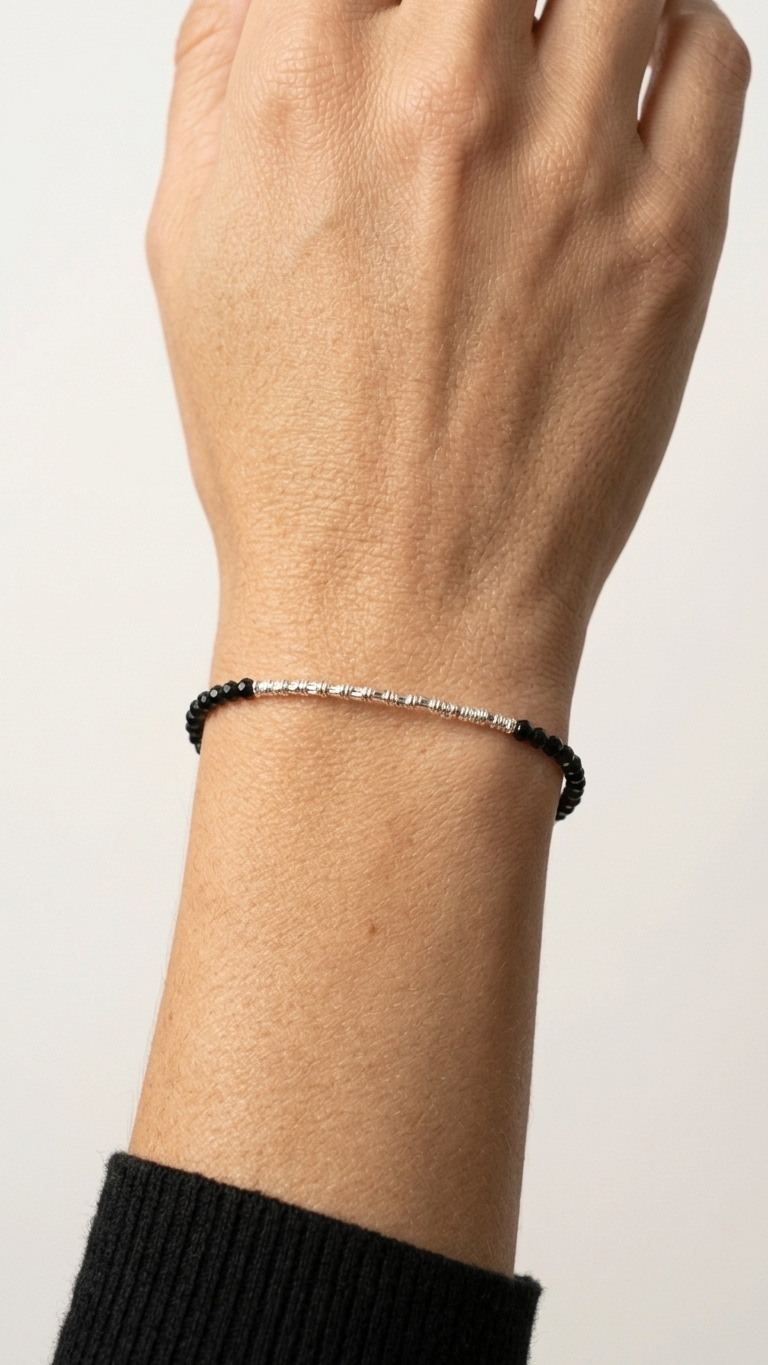 El negro de la espinela no admite términos medios. La pulsera Noir lo sabe y lo lleva con la convicción que merece: una ristra continua de espinela negra facetada —pequeñas bolas perfectamente talladas con ese negro profundo y brillante, casi vítreo, que capta y devuelve la luz en miles de aristas diminutas— que rodea la muñeca con una densidad y un brillo que pocas piedras pueden igualar.